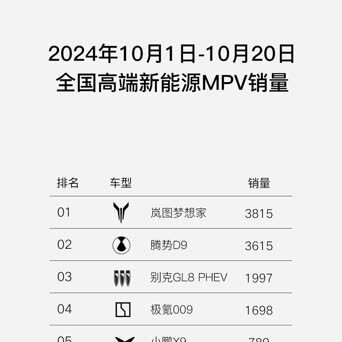 当然,榜单中除了岚图梦想家,还有腾势D9、别克GL8 PHEV、极氪009、小鹏X9等优秀的品牌车型紧随其后,最近新能源高端MPV的市场一直是非常火热,家商两用的可油可电的产品也是层出不穷。即使这样,还是看到了刚改完款的全新岚图梦想家的优秀成绩,可见其产品力是有多强!